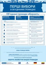 Poster in Ukrainian is devoted to the first elections in amalgamated communities and describes duties and responsibilities of the officials to be elected at the first elections. Available only in Ukrainian.