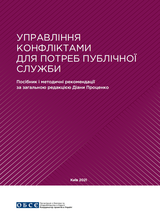 This publication contains theoretical background about conflicts and their management, analysis of the specificities of conflicts in the public service taking into account the results of sociological research on perception, attitude to conflicts and ways of managing conflicts in Ukrainian realities. An important component of this publication is an overview of best practices in conflict management in public service of other countries, as well as key approaches and regulatory framework for conflict resolution in accordance with the current Ukrainian legislation. The guidebook ends with two chapters with practical recommendations and tools for conflict management, in particular for implementation of an intervention with a view to its constructive completion, as well as for establishing of a conflict management system. All recommendations are based on the authors' practical experience and adaptation of international best practices. This publication was developed and published by the OSCE Project Co-ordinator in Ukraine in co-operation with the National Agency of Ukraine for Civil Service in the framework of the project “Enhancing Dialogue Capacity for Reforms Implementation” in 2021.