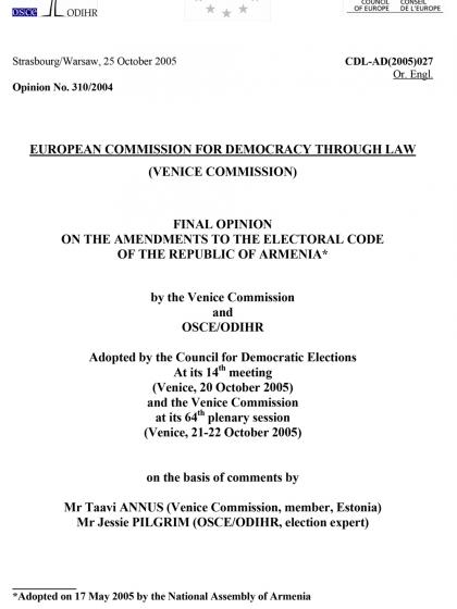 Final Opinion on the Amendments to the Electoral Code of the Republic of Armenia