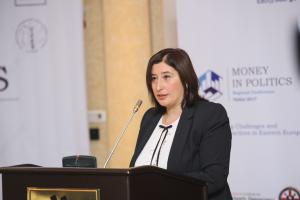 Tamar Zhvania, Chairperson of the Georgian Central Election Commission, addresses participants in a regional conference on the topic of money in politics co-organized by the OSCE Office for Democratic Institutions and Human Rights (ODIHR). 19 June 2017, Tbilisi.