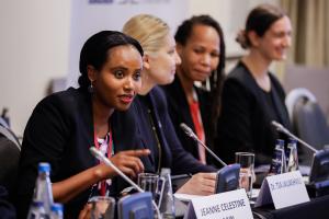 Jeanne Celestine Lakin, Chair of ODIHR’s International Survivors of Trafficking Advisory Council (left) and a panel of experts discussing long-term support for survivors of human trafficking. Warsaw, 15 October 2025.
