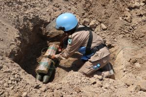 Participant of the regional Explosive Ordnance Disposal (EOD) Level 2 training course during practical exercises, Chimteppa, outskirts of Dushanbe, 17 May 2025.
