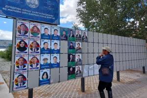 A voter in Mongolia’s parliamentary elections looks at candidate posters in Mandalgovi, Mongolia. 28 June 2024.