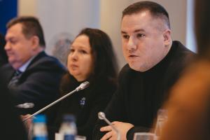 Mykhailo Spasov of the Ukrainian Ombuds Office speaking during a conference that brought together Ukrainian authorities, Roma civil society representatives and international experts to discuss ways to tackle war-related challenges facing Ukrainian Roma. Warsaw, 7 March 2023.