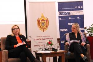 Chair of Albania's Constitutional Court Holta Zaçaj (l) and Acting Head of OSCE Presence in Albania Clarisse Pasztory address the launching event of the first guide of Constitutional Court Case Law, Tirana, 21 February 2024.