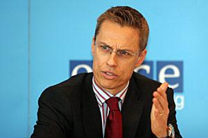 OSCE Chairman-in-Office, Finnish Foreign Minister Alexander Stubb, gestures as he answers a question at a news conference in Vienna, 10 April 2008.