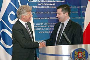 OSCE High Commissioner on National Minorities, Knut Vollebaek (left), and Georgia's Foreign Minister, David Bakradze, at a joint press conference after talks in Tbilisi, 7 April 2008.
