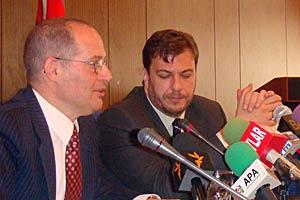 OSCE Representative on Freedom of the Media, Miklos Haraszti (left), and Ambassador Jose-Luis Herrero, the Head of the OSCE Office, at a news conference in Baku, 7 April 2008.