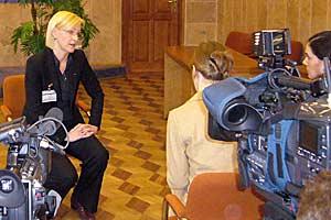 OSCE Special Representative for Combating Trafficking in Human Beings, Eva Biaudet, gives a TV interview in Minsk, Belarus, 10 April 2008.