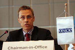 OSCE Chairman-in-Office, Finnish Foreign Minister Alexander Stubb, addresses the Permanent Council in Vienna, 10 April 2008.