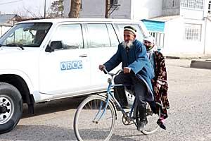 A Tajik man and woman ride on a bicycle south of Kurgan Tube, 29 February 2008.