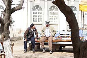 Elderly men chat at a market south of the Tajik city of Kurgan Tube, 29 February 2008.