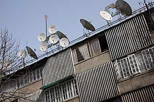 Satellite dishes on a rooftop in the Tajik capital Dushanbe, 28 February 2008.