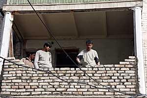 Tajik men build a brick wall on a balcony in Dushanbe, 28 February 2008.