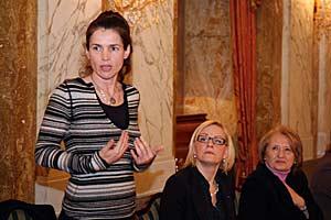 British actress Julia Ormond speaks at a breakfast hosted by Eva Biaudet (Centre), the OSCE Special Rep. for combating human trafficking, in Vienna, 14 February 2008. Melanne Verveer, co-founder of the Vital Voices Global Partnership, looks on.