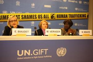 L-r: Eva Biaudet, OSCE Special Representative; Melanne Verveer, Co-Founder and Chair of Vital Voices Global Partnership; and Ndioro Ndiaye, Deputy Director General of the International Organization for Migration, at the UN.GIFT Forum, Vienna, 14 Feb 2008.
