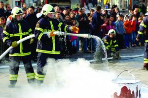 Kosovo firefighters during a fire simulation exercise in front of hundreds of schoolchildren and citizens as part of the Open Day supported by the OSCE Mission in Kosovo, Gjilan/Gnjilane, 20 November 2007.