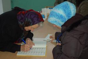 A women signs the voter list to confirm that she has received her ballots at "Motrat Qiriazi" primary school polling station in Prizren, during Kosovo's elections on 17 November 2007.