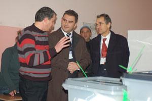 The Head of the OSCE Mission in Kosovo, Ambassador Tim Guldimann (right), is briefed by an election official at "Motrat Qiriazi" primary school polling station, Prizren, 17 November 2007.
