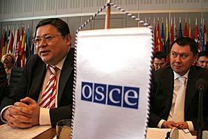 Kazakh Foreign Minister Marat Tazhin speaks to the OSCE Permanent Council in Vienna, 30 April 2007, as Ambassador Rakhat Aliyev of Kazakhstan looks on.