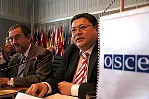 Kazakh Foreign Minister Marat Tazhin (right) speaks to the OSCE Permanent Council in Vienna, 30 April 2007, as Chairman of the Permanent Council, Ambassador Carlos Sanchez de Boado of Spain, looks on.