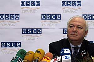 OSCE Chairman Miguel Angel Moratinos at a news conference in Pristina 27 February 2007.