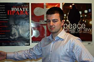 Petar Jordanovski, the OSCE Mission to Skopje's Human Rights Support Project Co-ordinator, presents posters developed for a public awareness campaign.