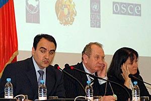 Arthur Baghdasaryan, Speaker of the Armenian National Assembly (left), Vladimir Pryakhin, Head of the OSCE Office in Yerevan (centre), and UNDP Representative Consuelo Vidal at an international conference on anti-corruption, in Yerevan, 6 April 2006.
