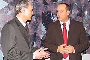 Chairman of the Albanian State Committee on Property Restitution and Compensation, Sokrat Sinaj (right), discusses property-related issues with Head of Presence Pavel Vacek, Tirana, 14 March 2006.