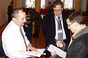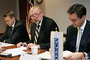 The Head of the ODIHR Election Observation Mission to Moldova, Ambassador Istvan Gyarmati (centre), meets with a polling station official during parliamentary elections on 6 March 2005.