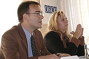 Julije Katancevic (left), a public information officer with the OSCE Mission to Croatia, moderates at a regional conference on the role of media in the stabilization and democratization process in Sisak, Croatia, 2 October 2003.