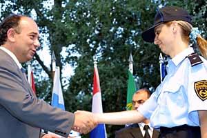 Interior Minister Hari Kostov presents the diploma to a police cadet who finished her three-month OSCE training course in Idrizovo, 30 July 2003.