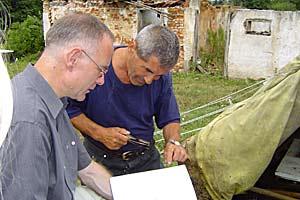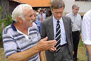 July 2003: Djuradj Lukac tells his story to Head of OSCE Mission to Croatia, Peter Semneby. After Lukac returned, he spent the first week camping under and oak tree in front of his occupied home.