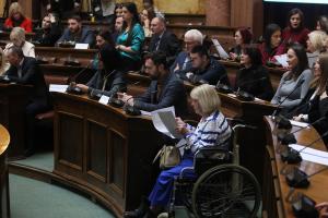 Participants of the presentation of the report on Accessibility of the National Assembly for Persons with Disabilities, commissioned by ODIHR, participate in a discussion on the Report's recommendations, on the occasion of marking the International Day of Persons with Disabilities, Belgrade, 3 December 2024