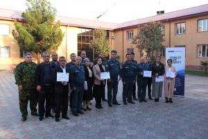 Participants of the OSCE-organized training for the Republican Training and Methodological Centre of Tajikistan's Committee of Emergency Situations and Civil Defence are posing for a group photo in Khujand, 27 October 2023.