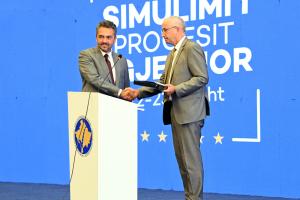 Ambassador Michael Davenport, Head of OSCE Mission in Kosovo, hands over to Central Election Commission Chair Kreshnik Radoniqi, the newly developed election software, 22 August 2024.