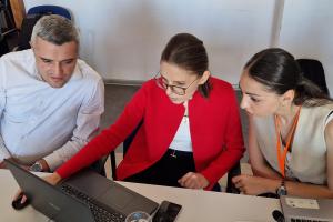 Malborë Qerimi showing a resident request to Burim Gashi, Head of the General Administration Section, during her apprenticeship with the Lipjan/Lipljan municipality, 1 August 2024.