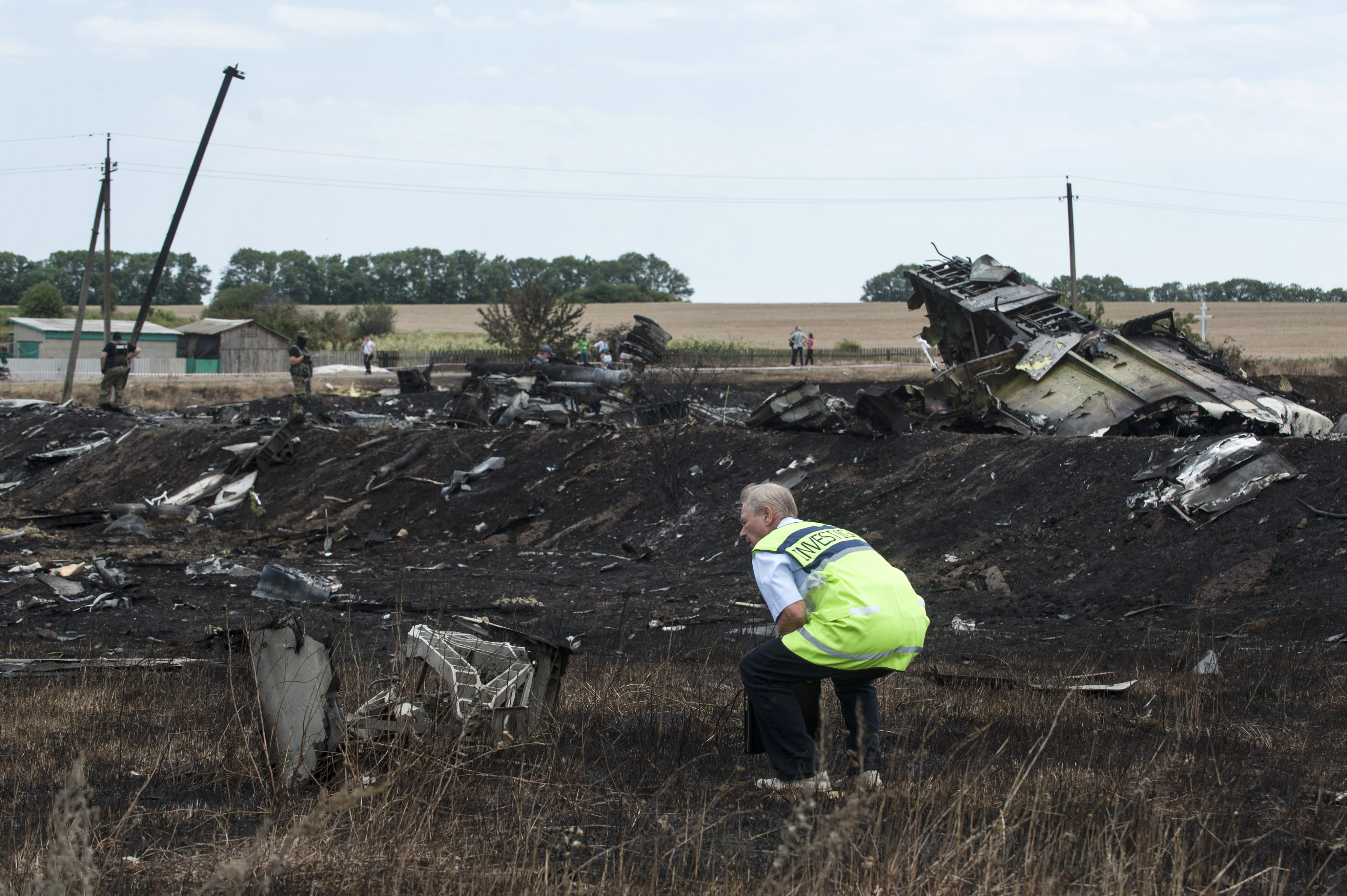 Украинский судебно-медицинский эксперт осматривает обломки на месте аварии MH17.