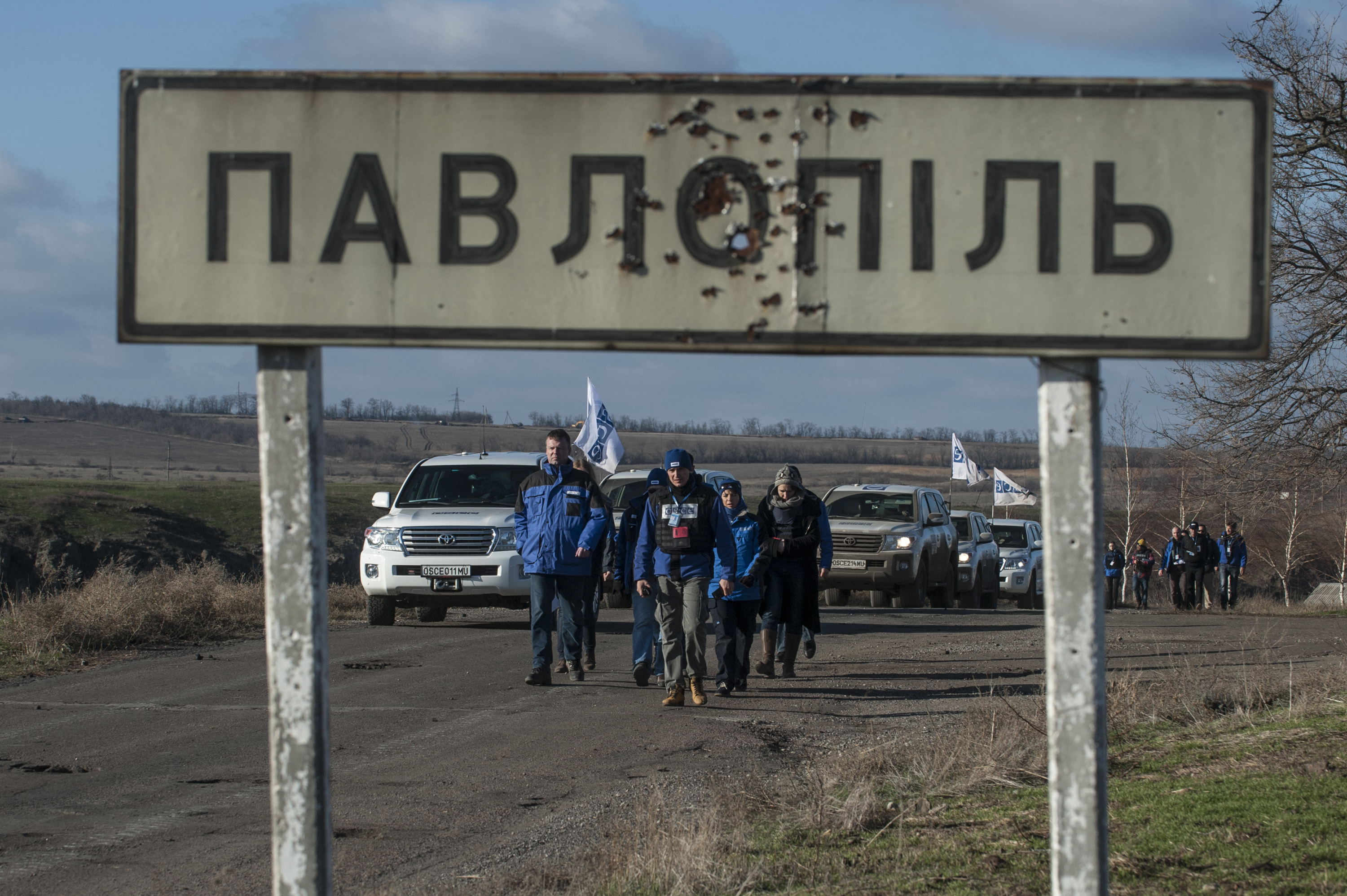 Наблюдатели СММ ОБСЕ посещают Павлополь, чтобы оценить общую ситуацию с безопасностью, 8 декабря 2015 года.