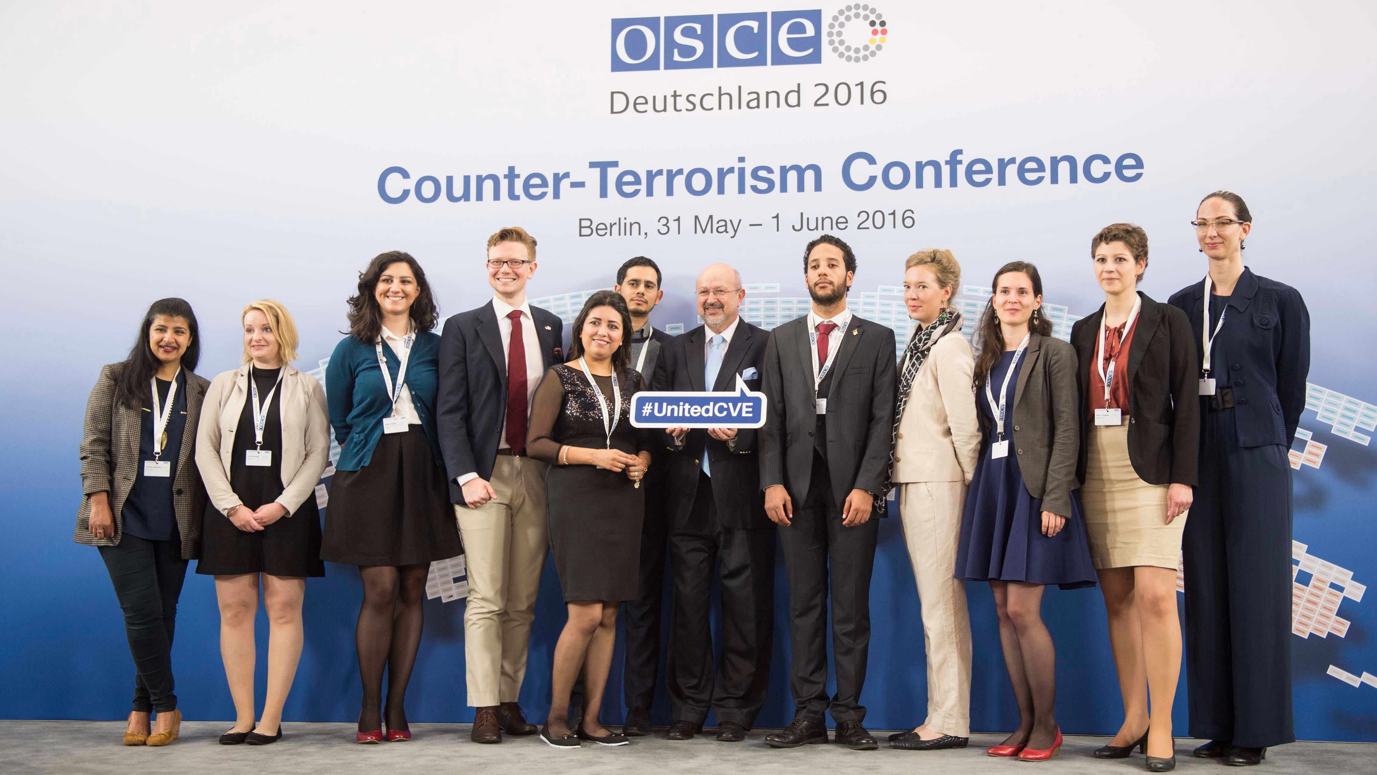 Молодые участники конференции ОБСЕ по борьбе с терроризмом вместе с Генеральным секретарем ОБСЕ Ламберто Заньер, Берлин, 31 мая 2016 года.
