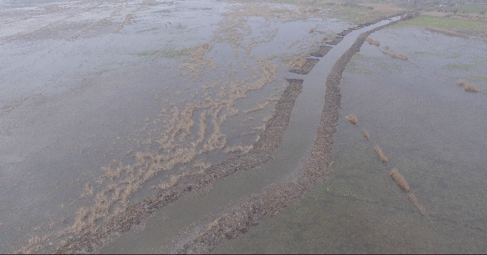 Ерик «Застойный» после его расчистки от ила и растительности в апреле 2016 г. Вдоль ерика насыпаны маленькие островки для того, чтобы птицы и другие животные могли их использовать как убежище во время паводка.