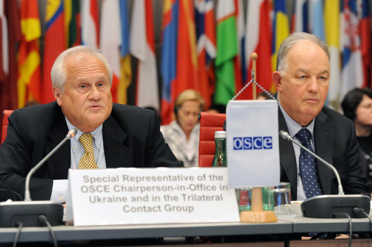 (слева направо) Посол Мартин Сайдик, Специальный представитель Действующего председателя ОБСЕ в Украине и в Трехсторонней контактной группе, и Посол Эртурул Апакан, Глава Специальной мониторинговой миссии ОБСЕ в Украине, на заседании в рамках Форума ОБСЕ по вопросам сотрудничества в сфере безопасности, г. Вена, 4 октября 2016 г.