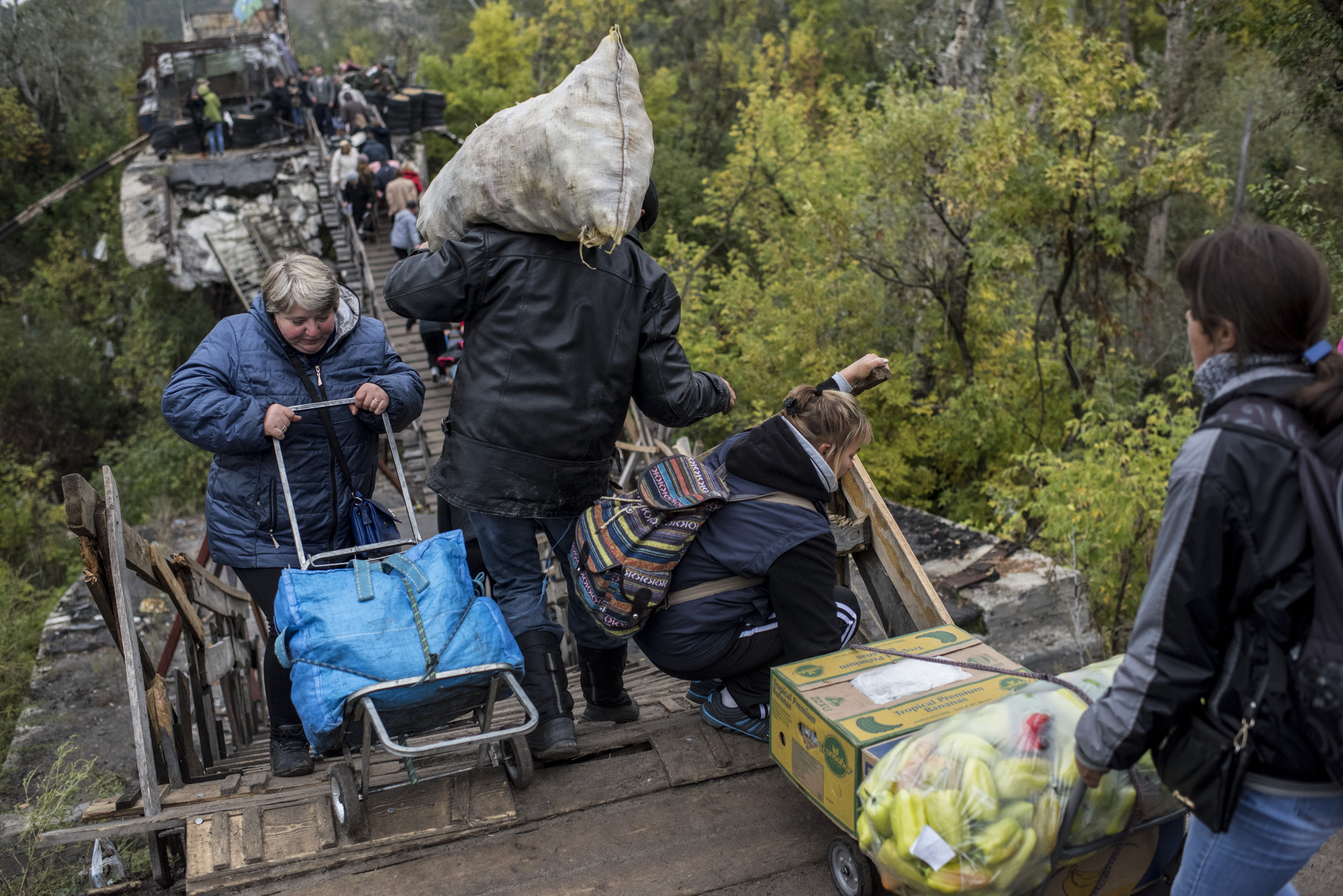 Мирные жители пересекают разрушенный мост в Станице Луганской, сентябрь 2016 года. Наблюдатели СММ снова и снова слышат, что люди по обе стороны линии разграничения уже достаточно настрадались — они заслуживают нормализации и готовы к разведению сил и средств.