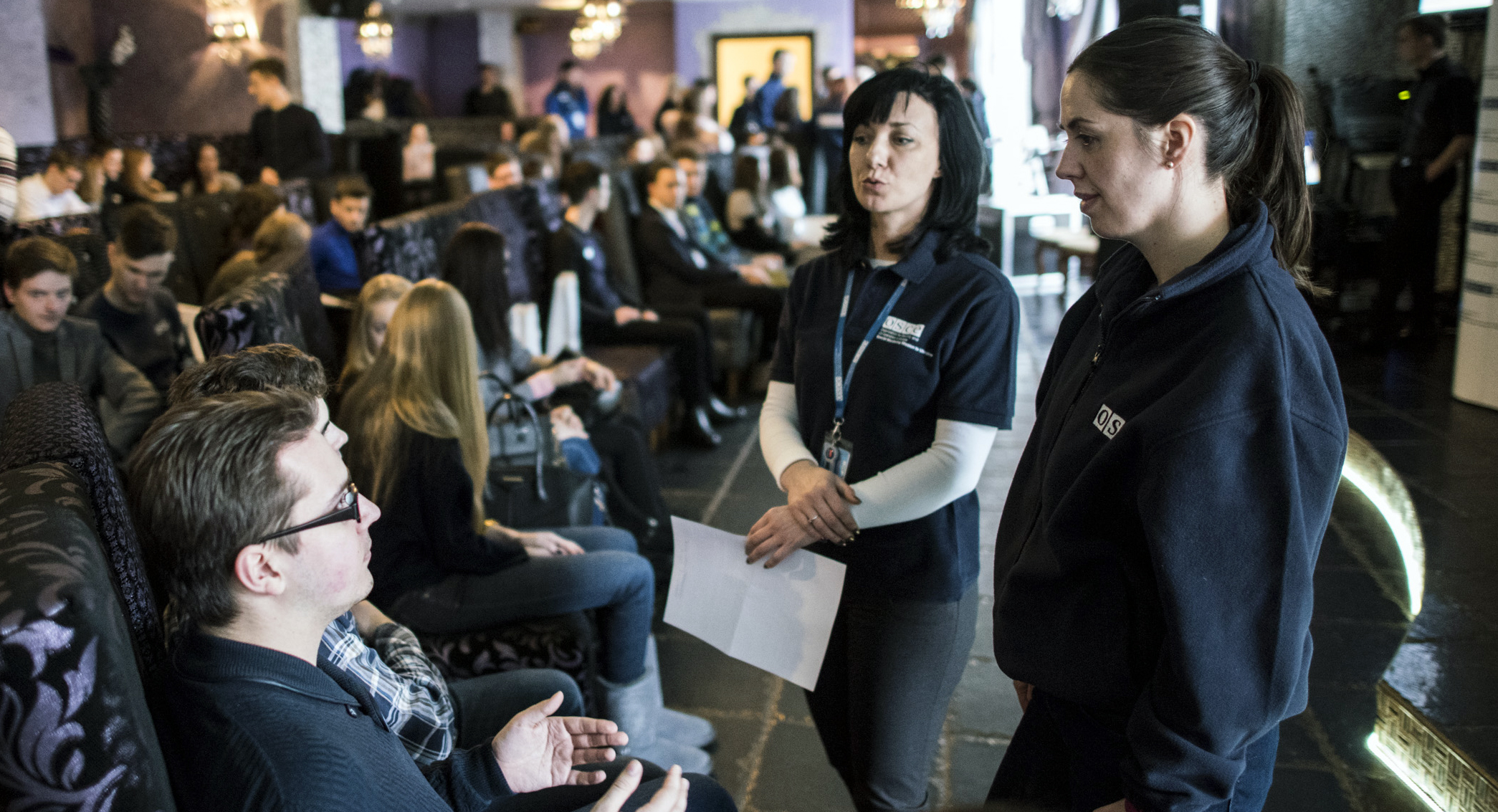 Сотрудницы Специальной мониторинговой миссии ОБСЕ в Украине ведут дискуссию со студентами во время ОБСЕ Café в Луганске, 16 февраля 2018 года.