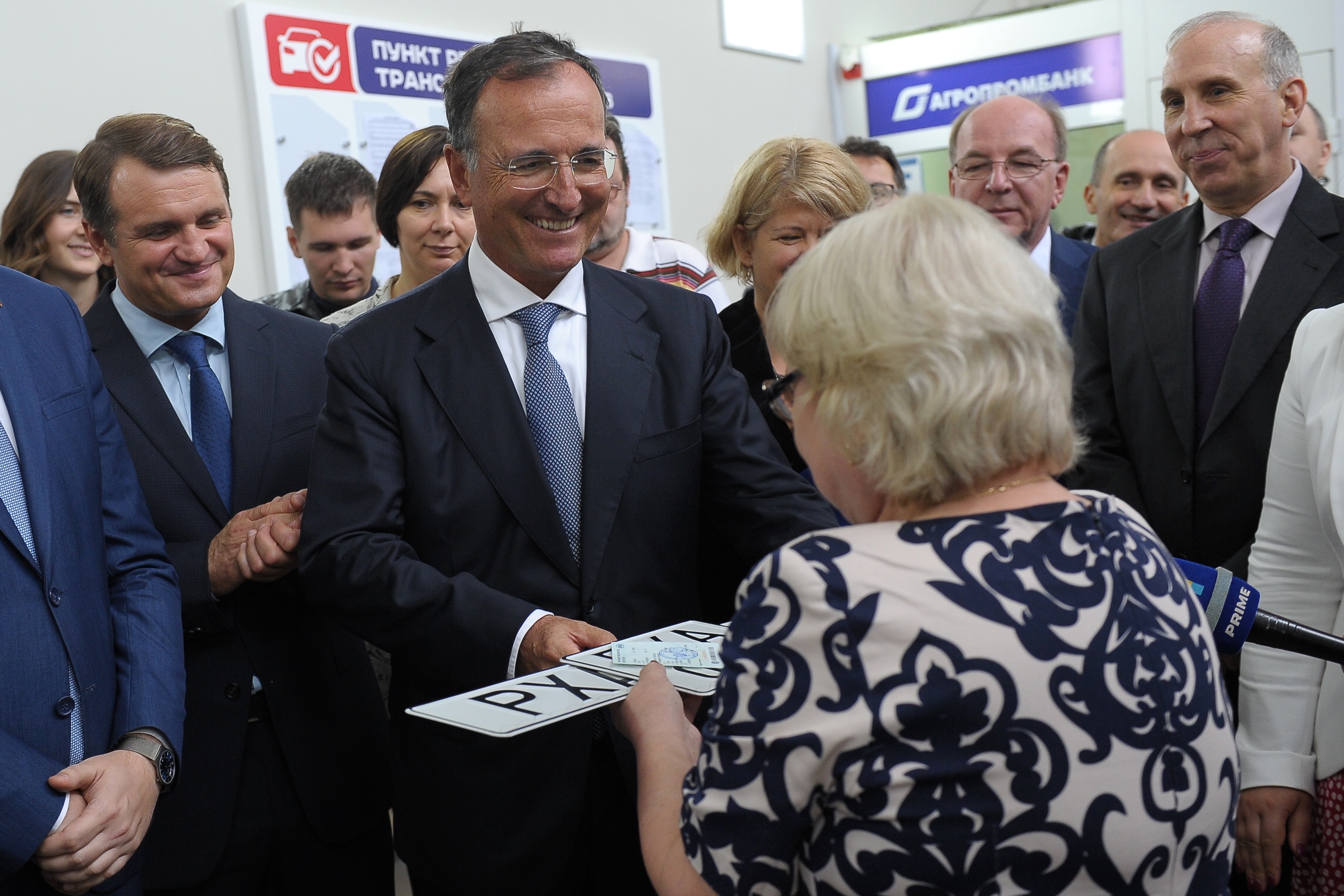 Франко Фраттини, cпециальный представитель Действующего председателя ОБСЕ по приднестровскому урегулированию, вручает первый молдавский номерной знак нейтрального дизайна в тираспольском пункте регистрации транспортных средств (ПРТС), 10 сентября 2018 года.