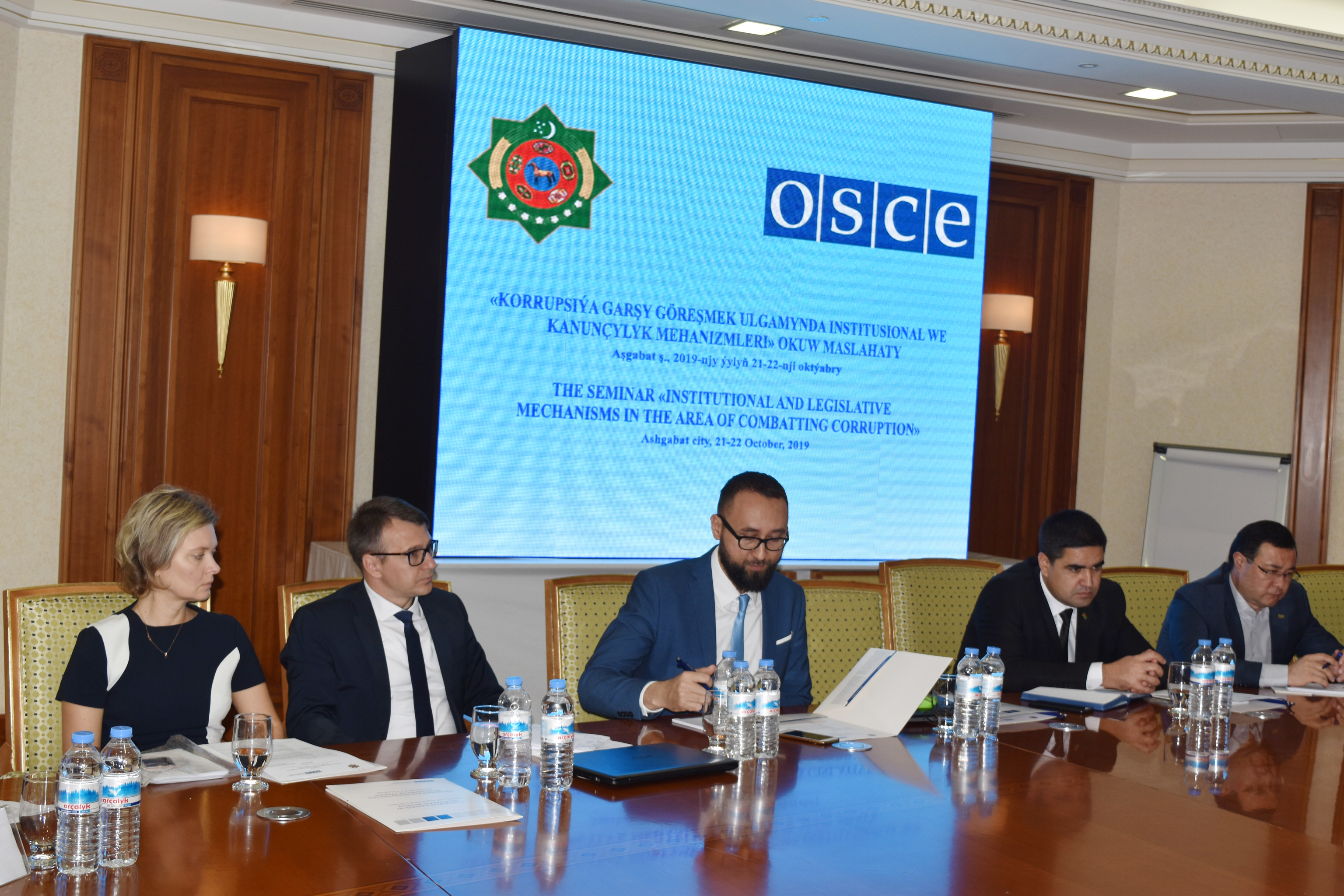 Курбан Бабаев, сотрудник по противодействию коррупции Бюро Координатора экономической и экологической деятельности ОБСЕ, обрашается к участникам семинара на тему «Институциональные и законодательные механизмы в сфере борьбы с коррупцией», Ашхабад, 21 октября 2019 года.