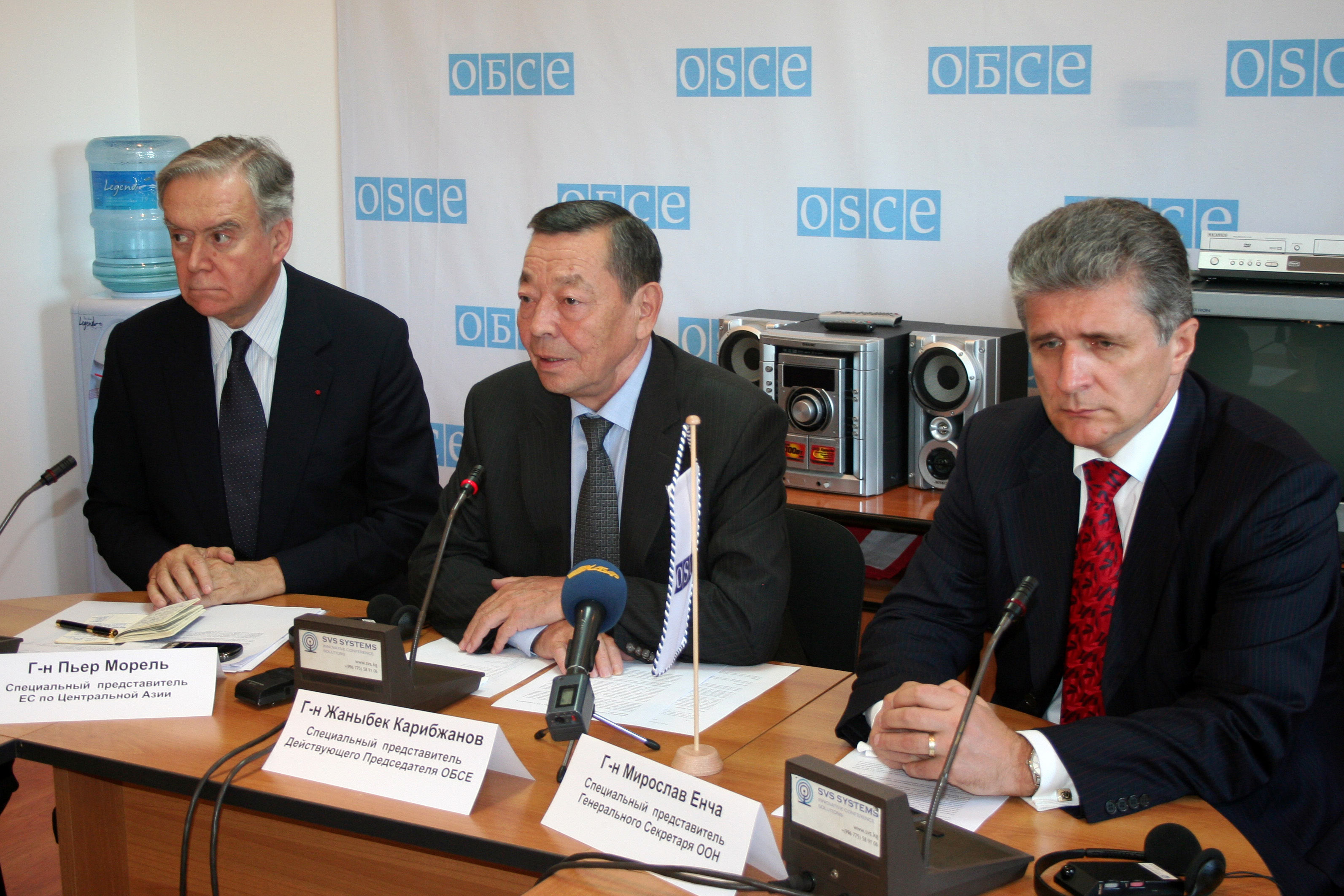 L-r: Pierre Morel, EU Special Representative for Central Asia; Zhanybek Karibzhanov, Special Envoy of the OSCE Chairperson-in-Office; Miroslav Jenca, Special Representative of the UN Secretary-General at a press conference in Bishkek, 14 September 2010.