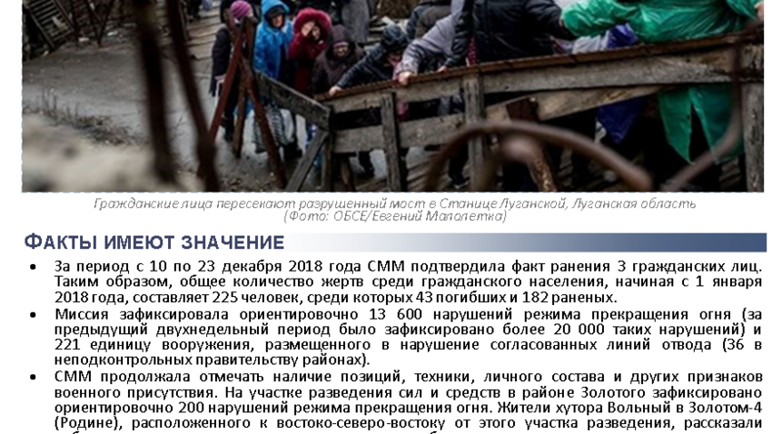 В отчете представлен обзор работы Специальной мониторинговой миссии ОБСЕ (СММ), последние события и новости по состоянию на 24 декабря 2018 года.