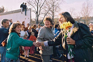 East and West Berliners greet each other at the newly opened border crossing at Schlesische Strasse/Puschkinallee on 11 November 1989.