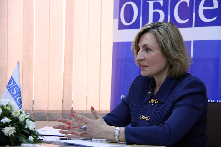Acting OSCE Co-ordinator for Combating Trafficking in Human Beings, Ruth Freedom Pojman, is interviewed by national television during her official visit in Astana on 3 April 2014.